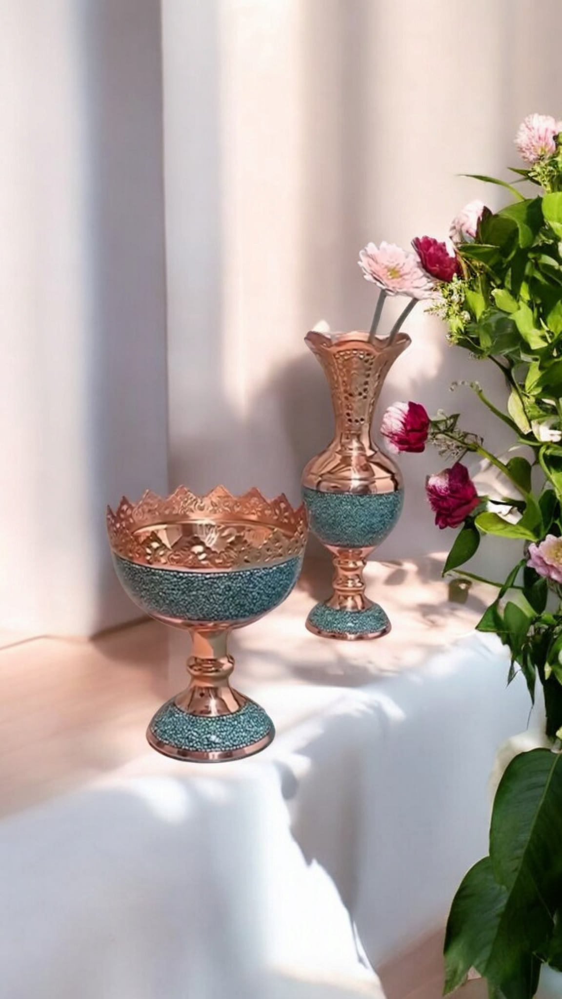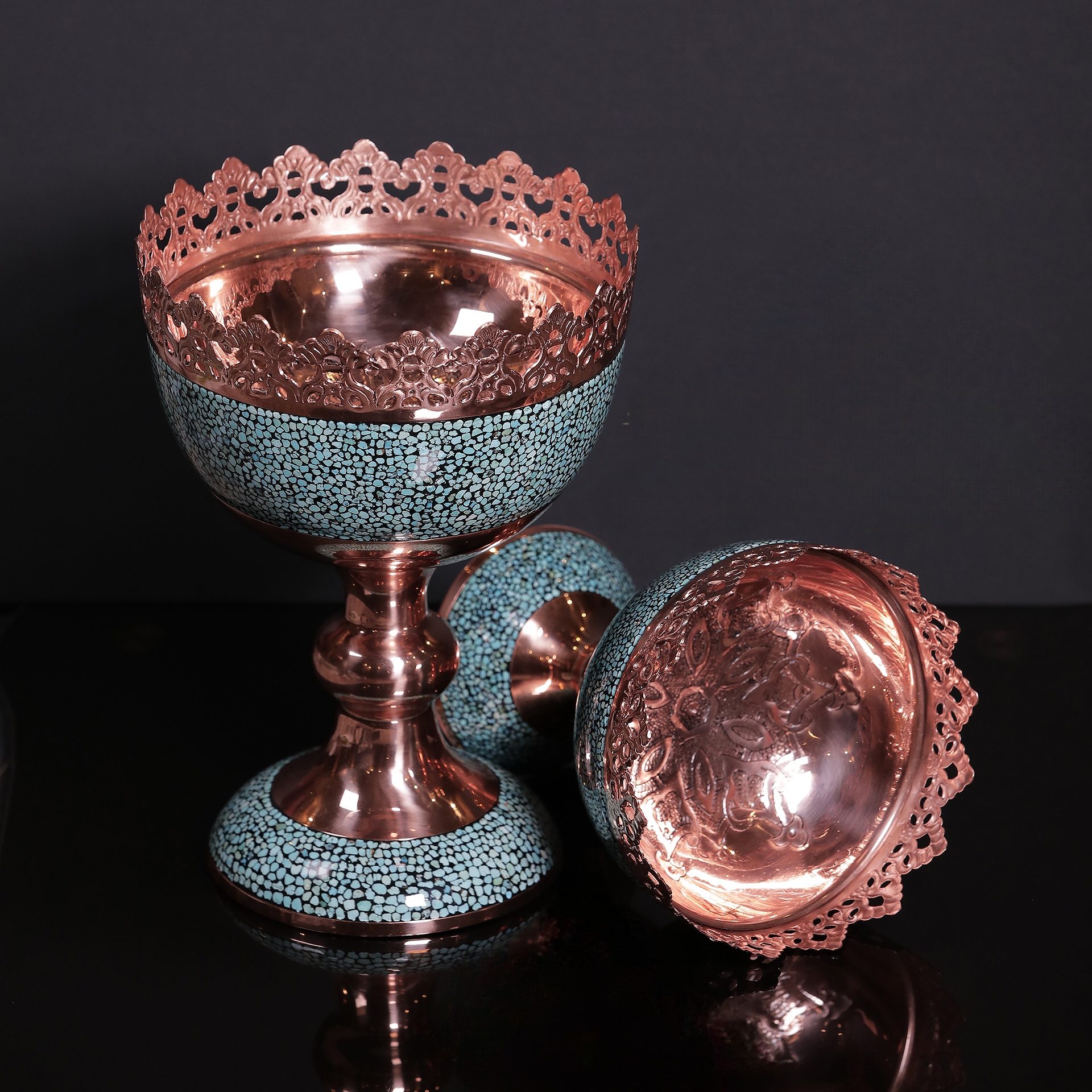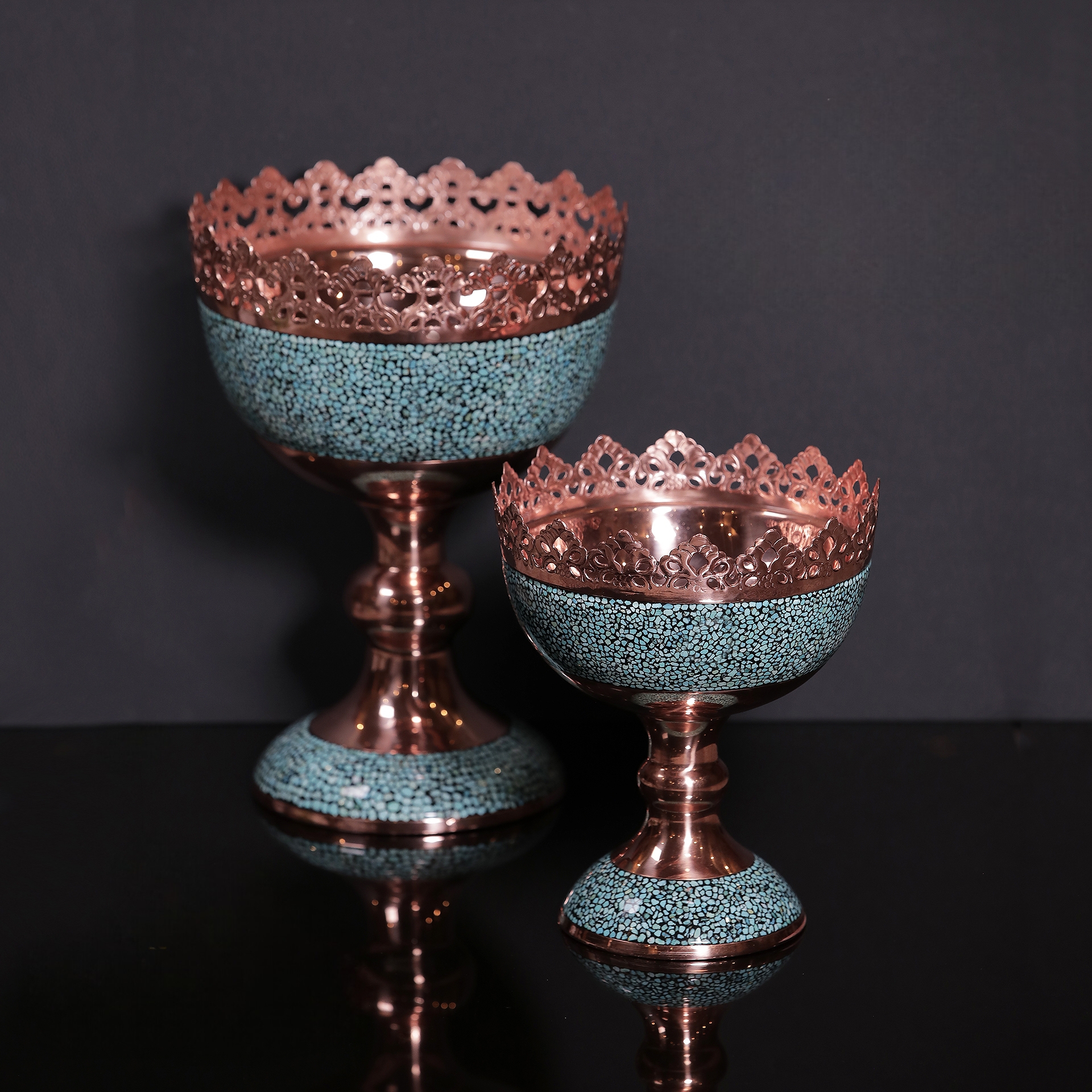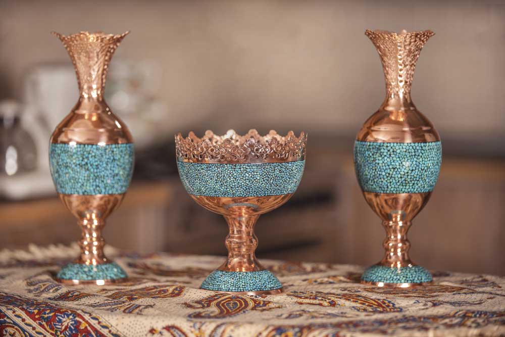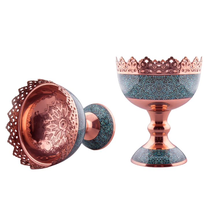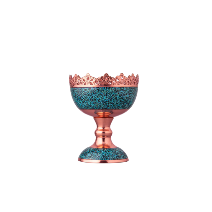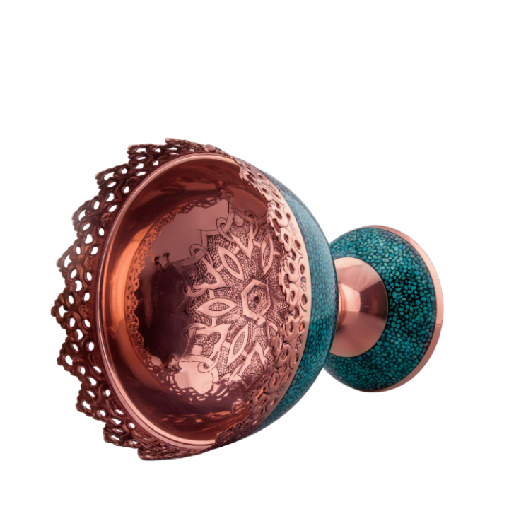در این اثر هنری، قطعات سنگ فیروزه نیشابور با دقت و ظرافت روی بدنهی مسی نشانده میشوند. ترکیب رنگ آبی فیروزه و درخشندگی مس، هارمونی خاصی ایجاد میکند که زیبایی دکوراسیون شما را دوچندان خواهد کرد.