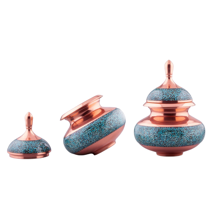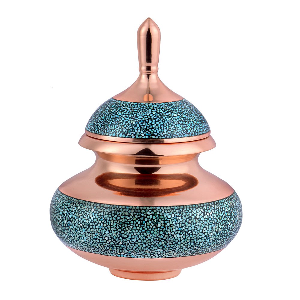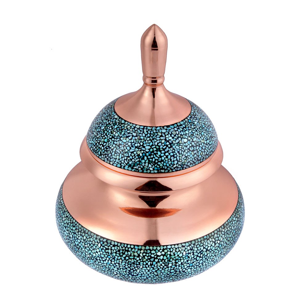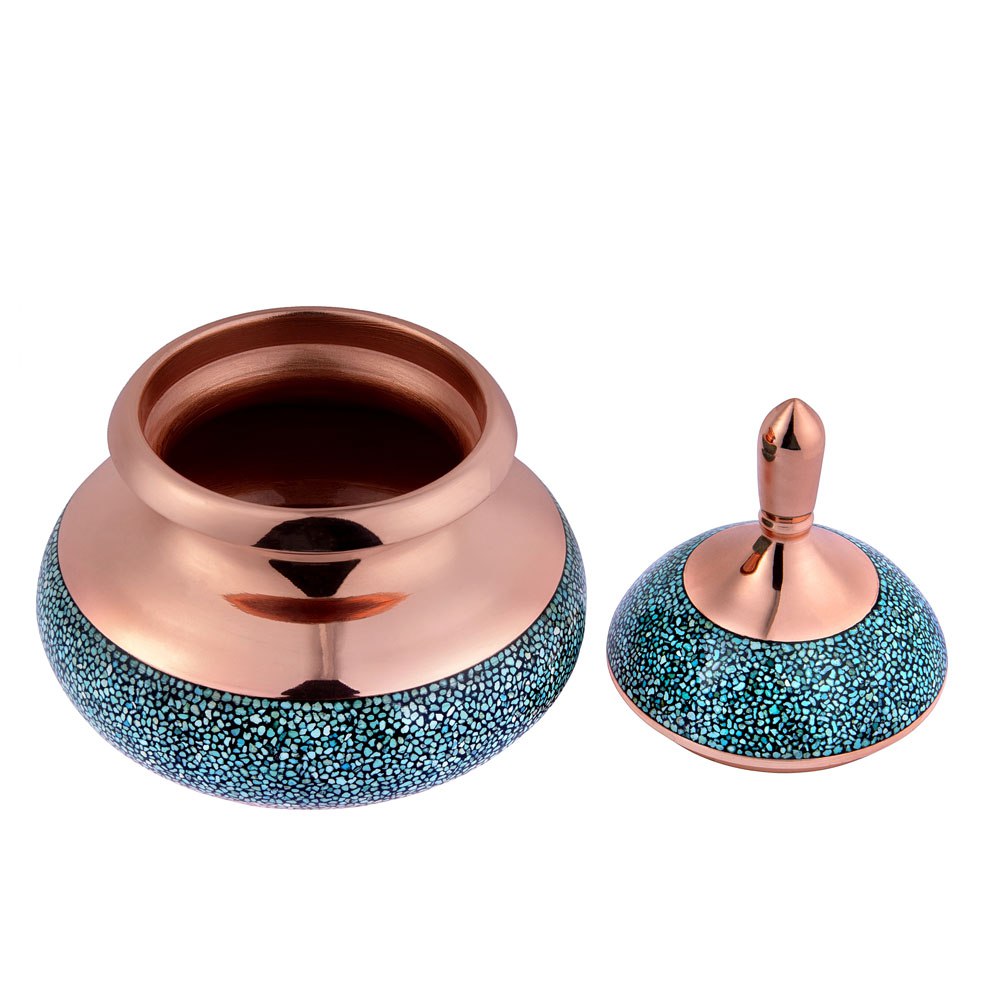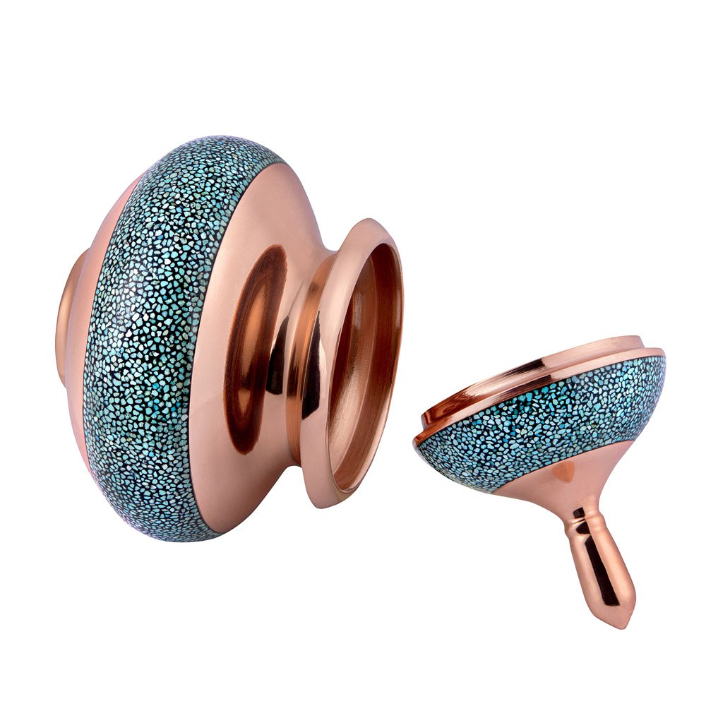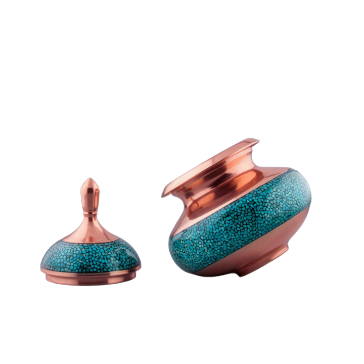 در این اثر هنری، قطعات سنگ فیروزه نیشابور با دقت و ظرافت روی بدنهی مسی نشانده میشوند. ترکیب رنگ آبی فیروزه و درخشندگی مس، هارمونی خاصی ایجاد میکند که زیبایی دکوراسیون شما را دوچندان خواهد کرد.
