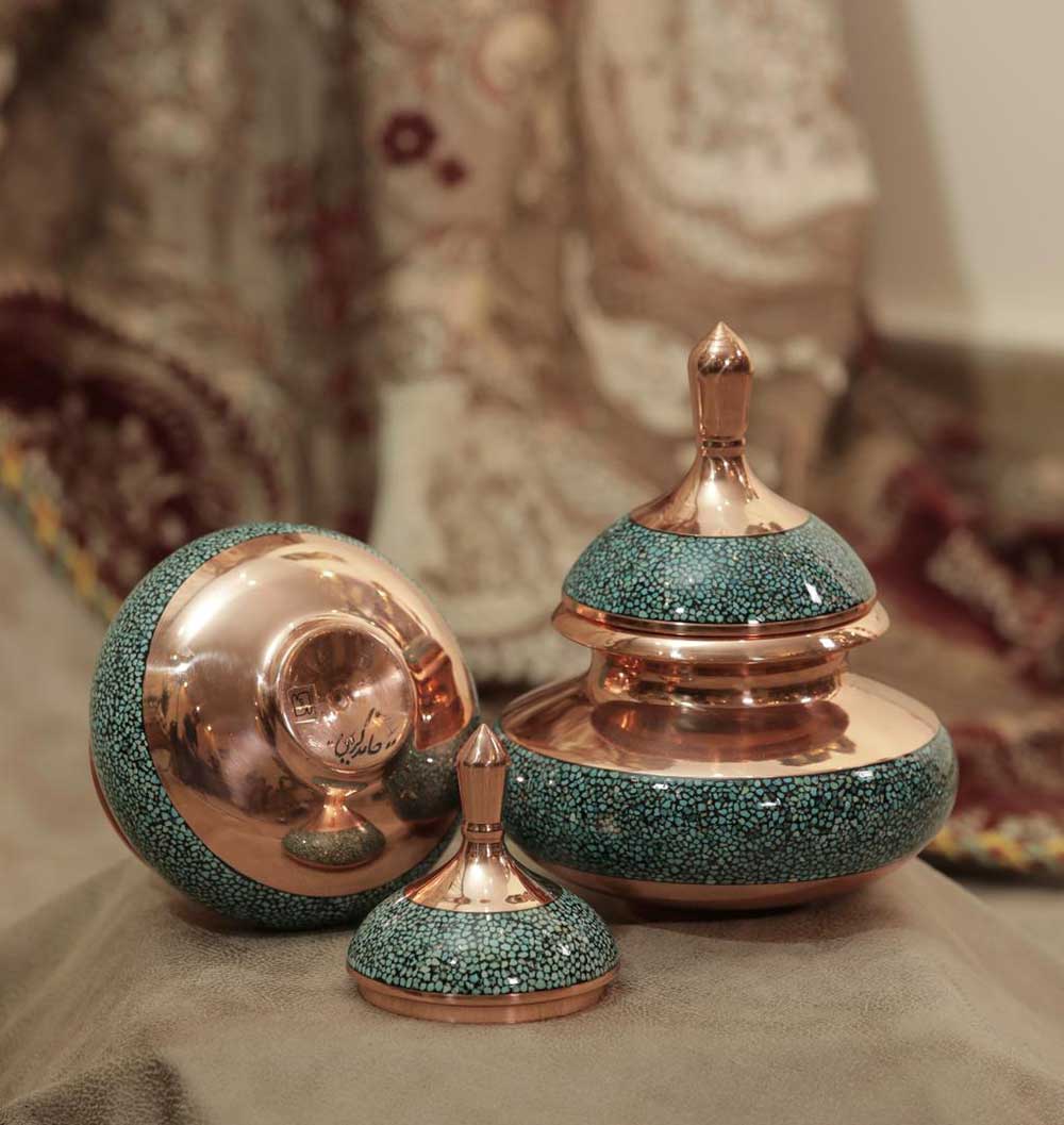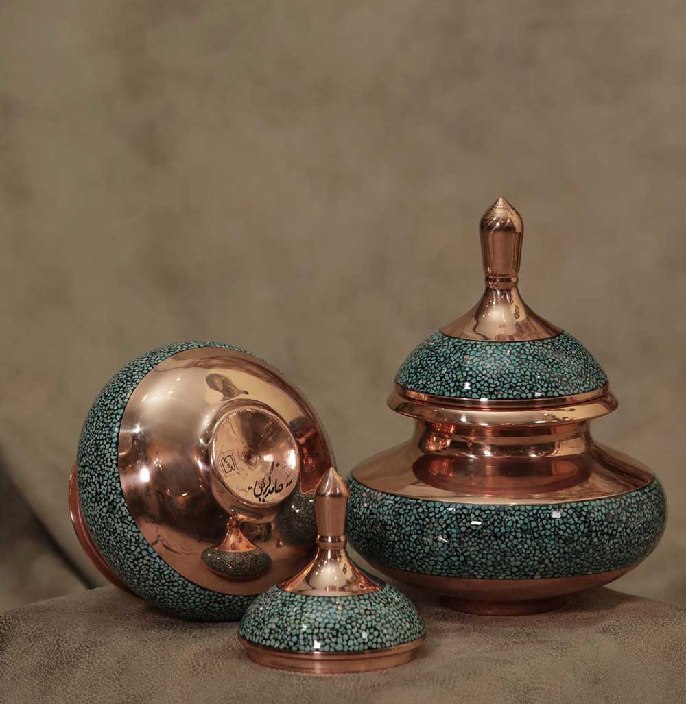 دخل فیروزهکوبی یک ظرف تزئینی سنتی اصفهانی است که با هنر ظریف فیروزهکوبی روی مس یا فلز ساخته میشود. این اثر علاوه بر زیبایی هنری و جلوه لوکس، کاربردی برای نگهداری اشیاء کوچک یا تزئین خانه دارد.
