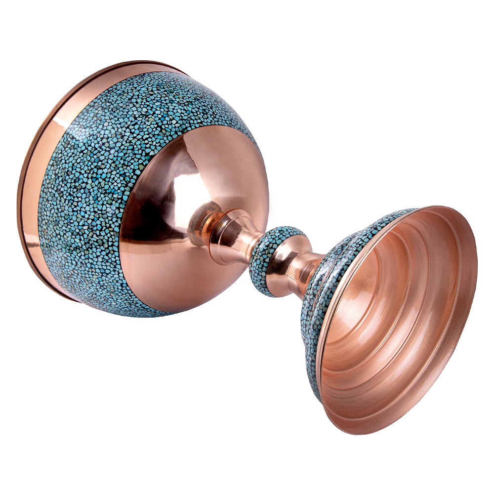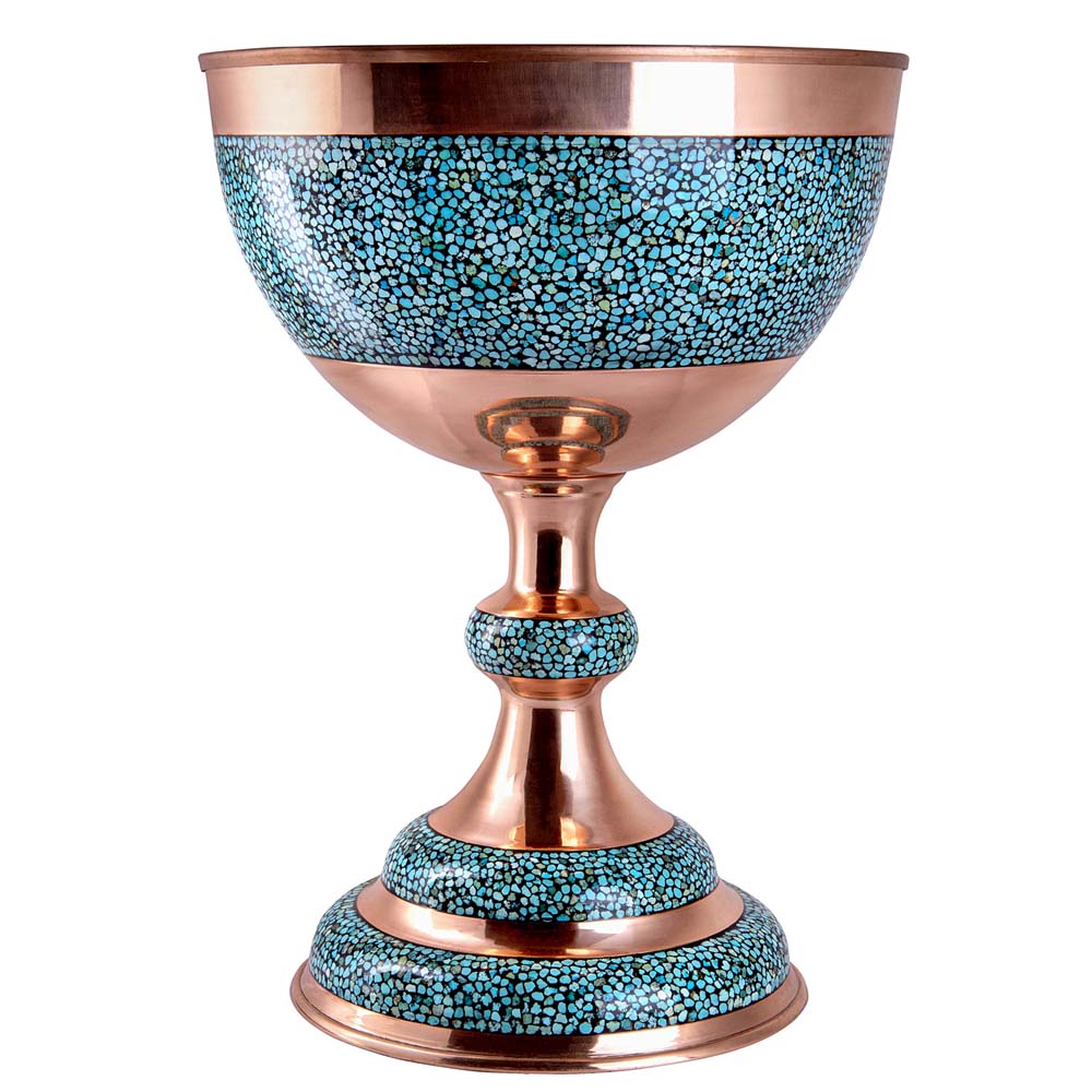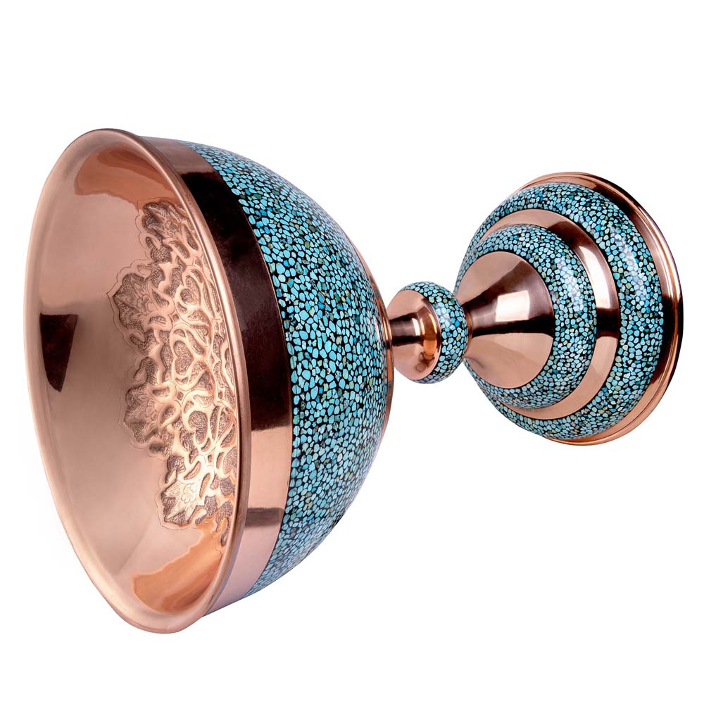 در این اثر هنری، قطعات سنگ فیروزه نیشابور با دقت و ظرافت روی بدنه‌ی مسی نشانده می‌شوند. ترکیب رنگ آبی فیروزه و درخشندگی مس، هارمونی خاصی ایجاد می‌کند که زیبایی دکوراسیون شما را دوچندان خواهد کرد.