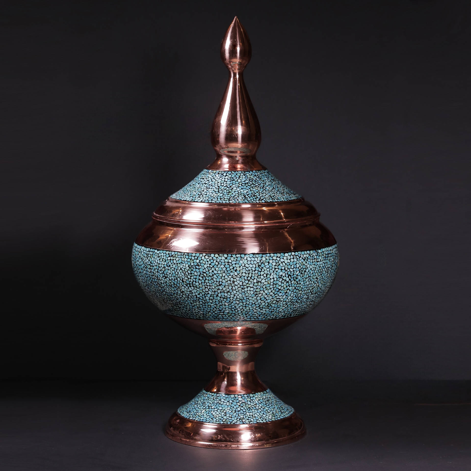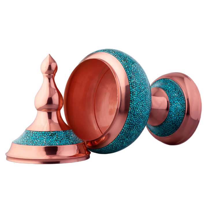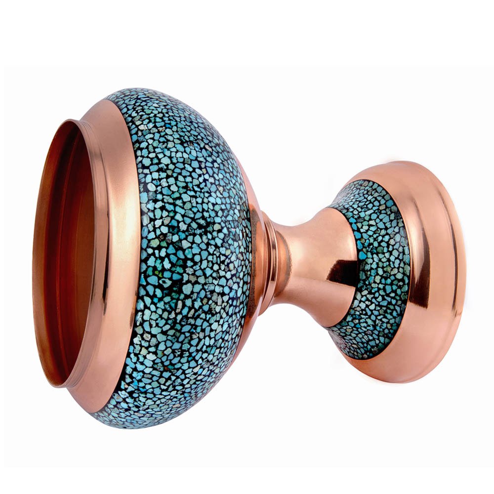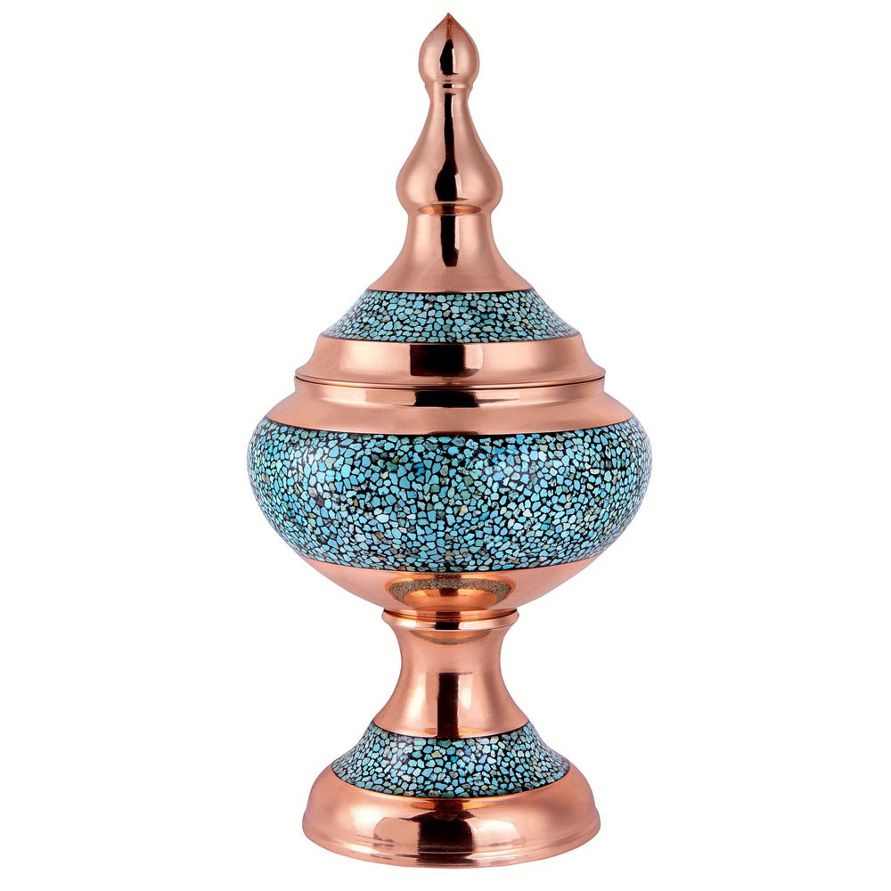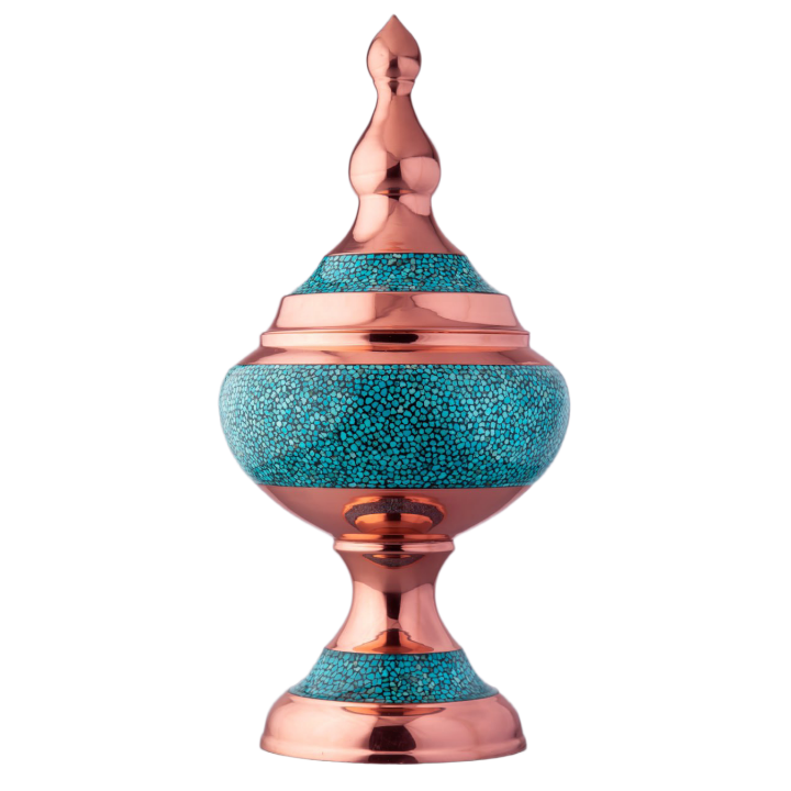 در این اثر هنری، قطعات سنگ فیروزه نیشابور با دقت و ظرافت روی بدنهی مسی نشانده میشوند. ترکیب رنگ آبی فیروزه