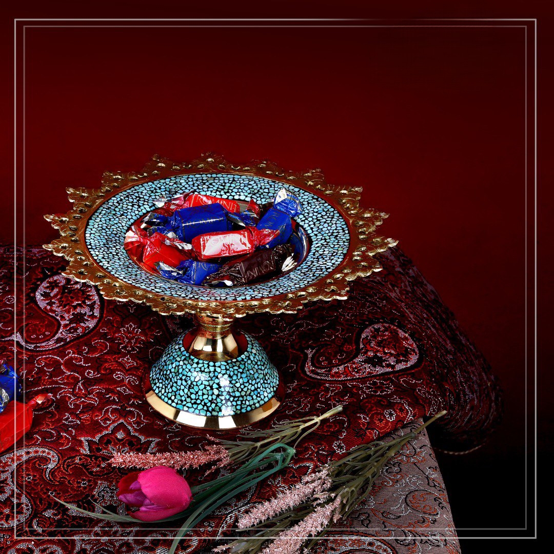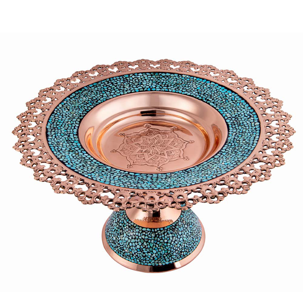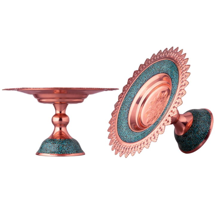 شیرینی خوری ساده فیروزه کوبی با طراحی شبیه سیب، ترکیبی از فلز مس و نگینهای فیروزه نیشابور است.