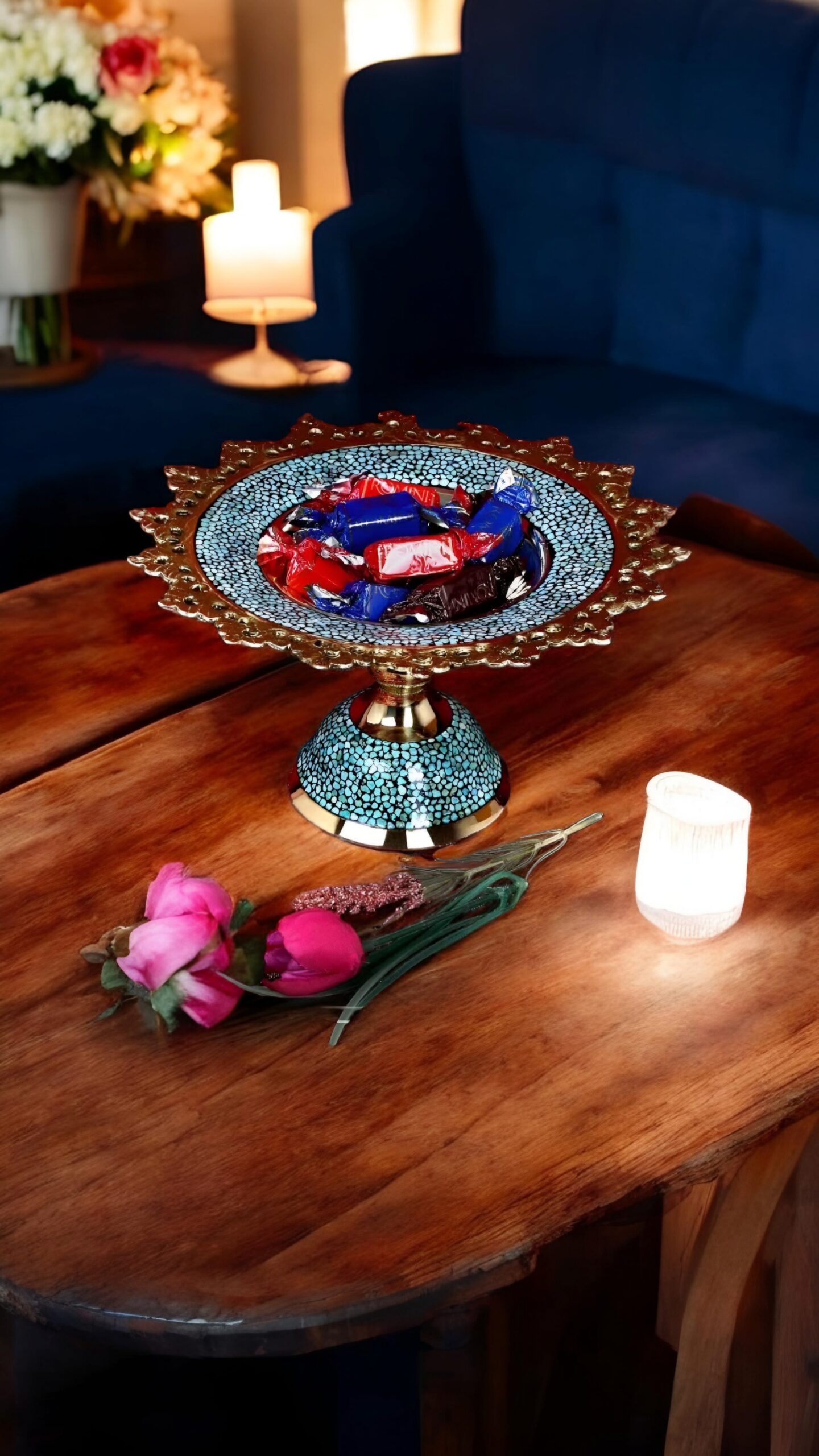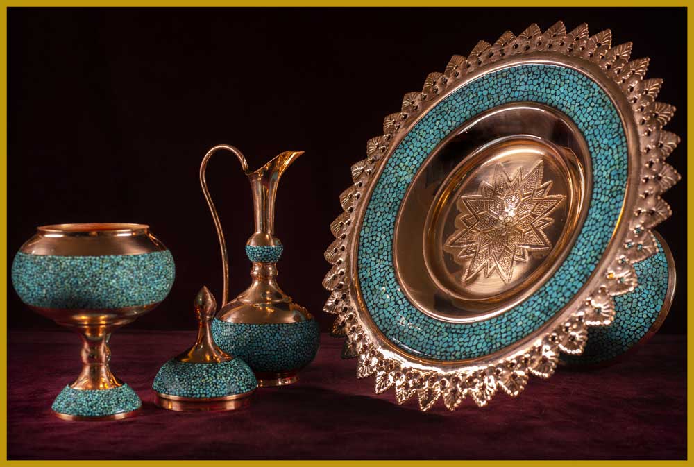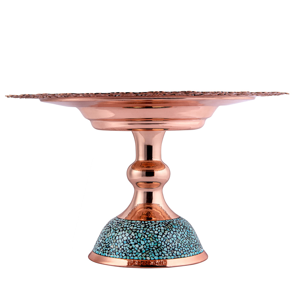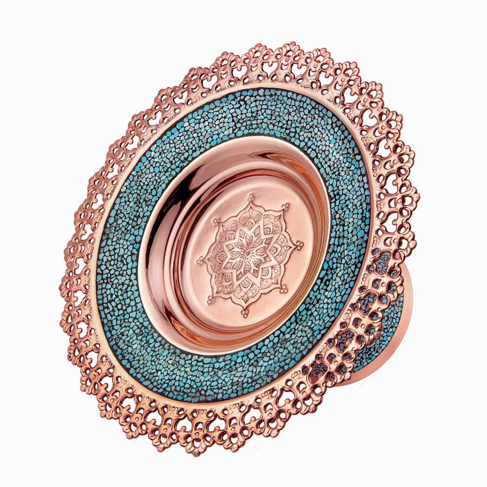 در این اثر هنری، قطعات سنگ فیروزه نیشابور با دقت و ظرافت روی بدنهی مسی نشانده میشوند. ترکیب رنگ آبی فیروزه و درخشندگی مس، هارمونی خاصی ایجاد میکند که زیبایی دکوراسیون شما را دوچندان خواهد کرد.