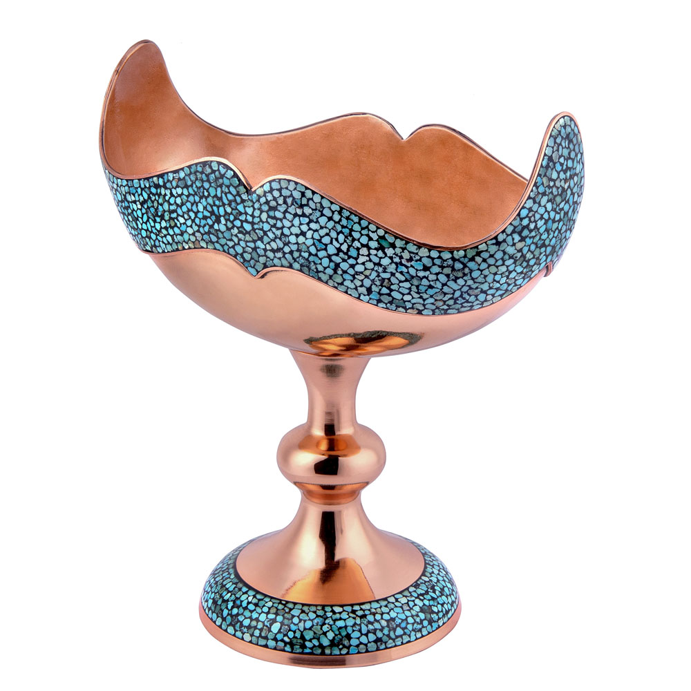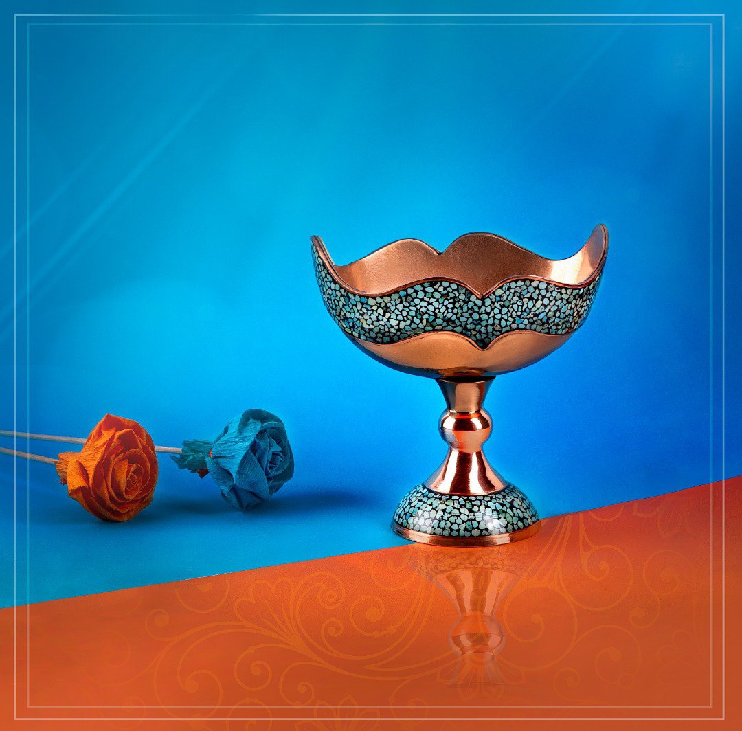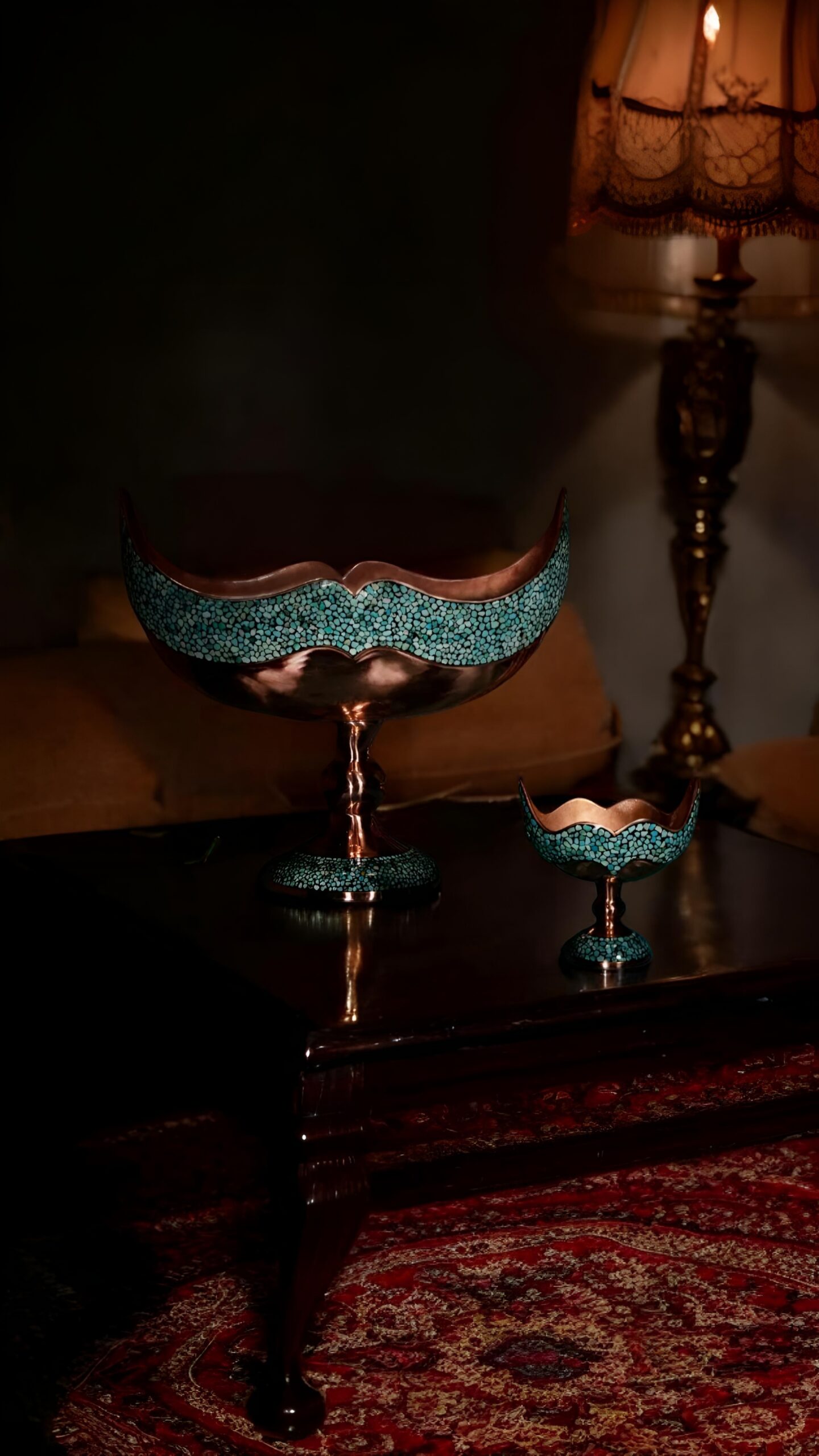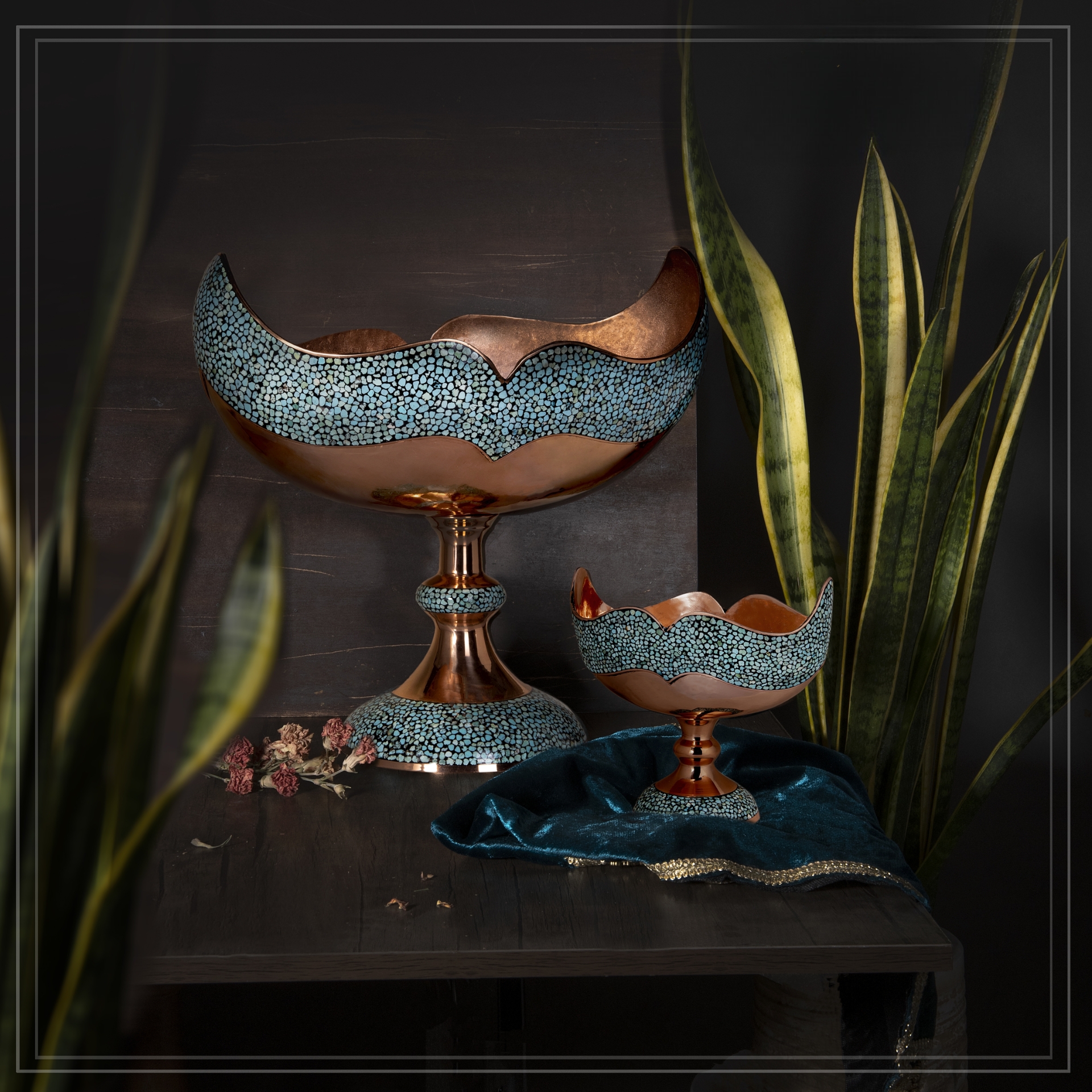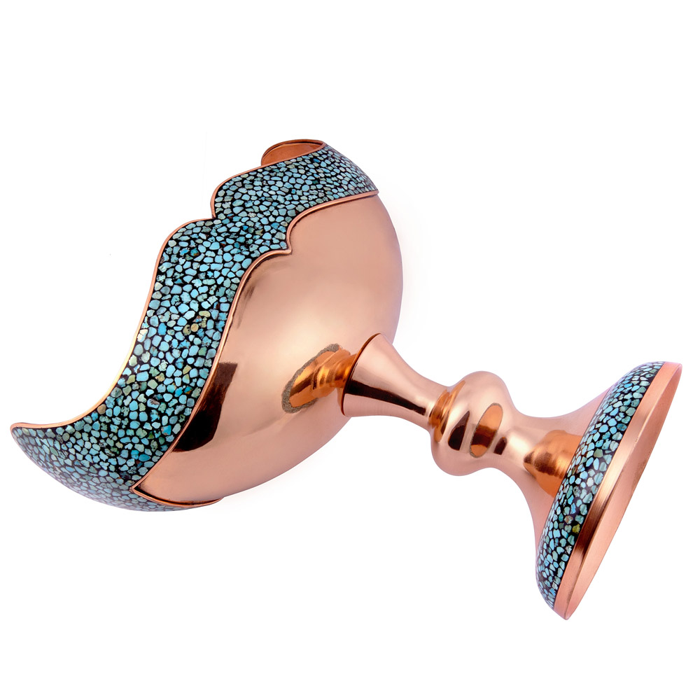 در این اثر هنری، قطعات سنگ فیروزه نیشابور با دقت و ظرافت روی بدنهی مسی نشانده میشوند. ترکیب رنگ آبی فیروزه و درخشندگی مس، هارمونی خاصی ایجاد میکند که زیبایی دکوراسیون شما را دوچندان خواهد کرد.