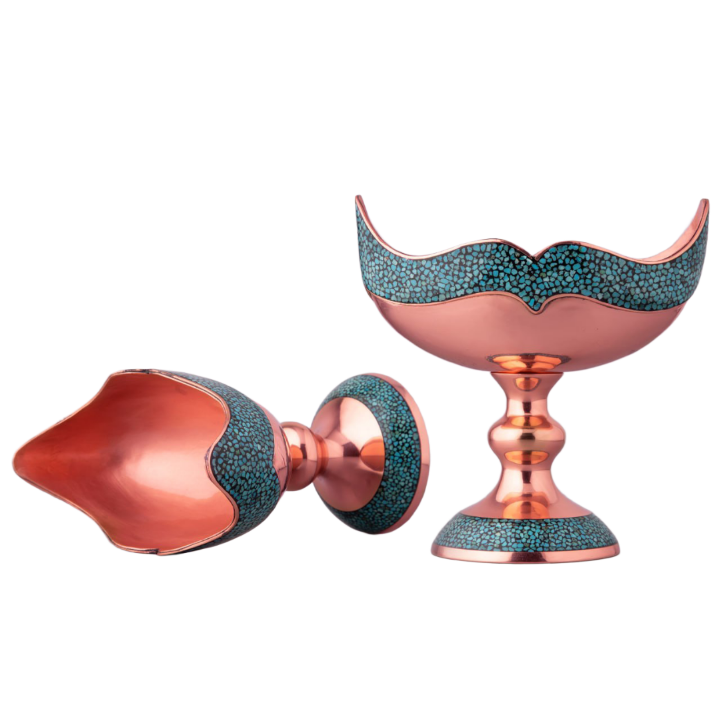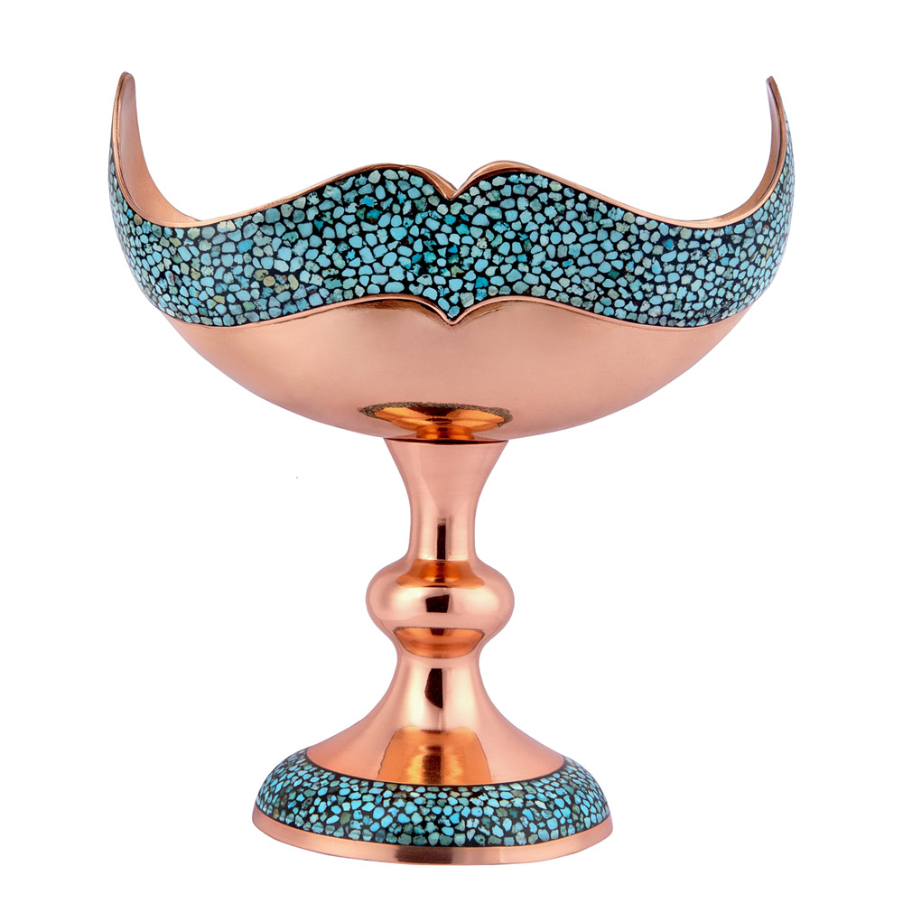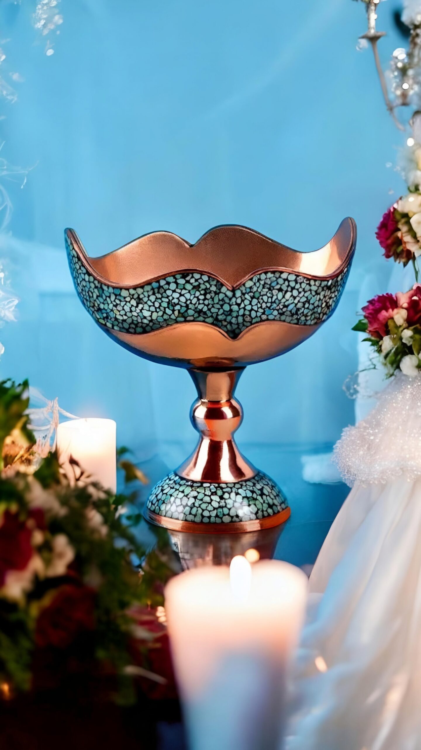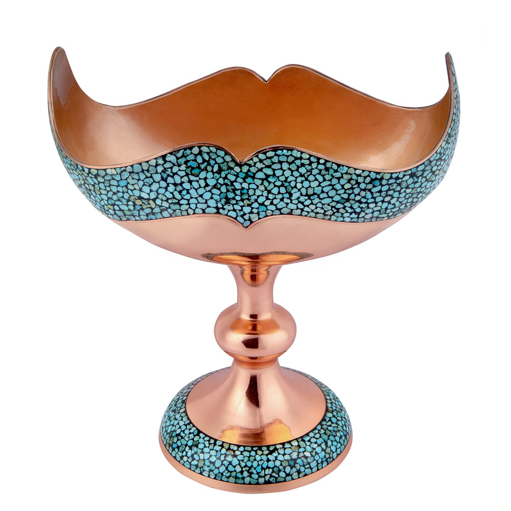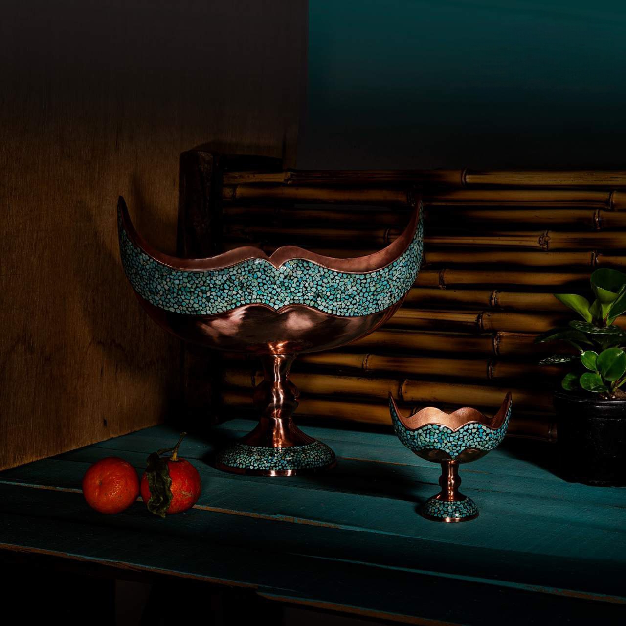 در این اثر هنری، قطعات سنگ فیروزه نیشابور با دقت و ظرافت روی بدنهی مسی نشانده میشوند. ترکیب رنگ آبی فیروزه و درخشندگی مس، هارمونی خاصی ایجاد میکند که زیبایی دکوراسیون شما را دوچندان خواهد کرد.