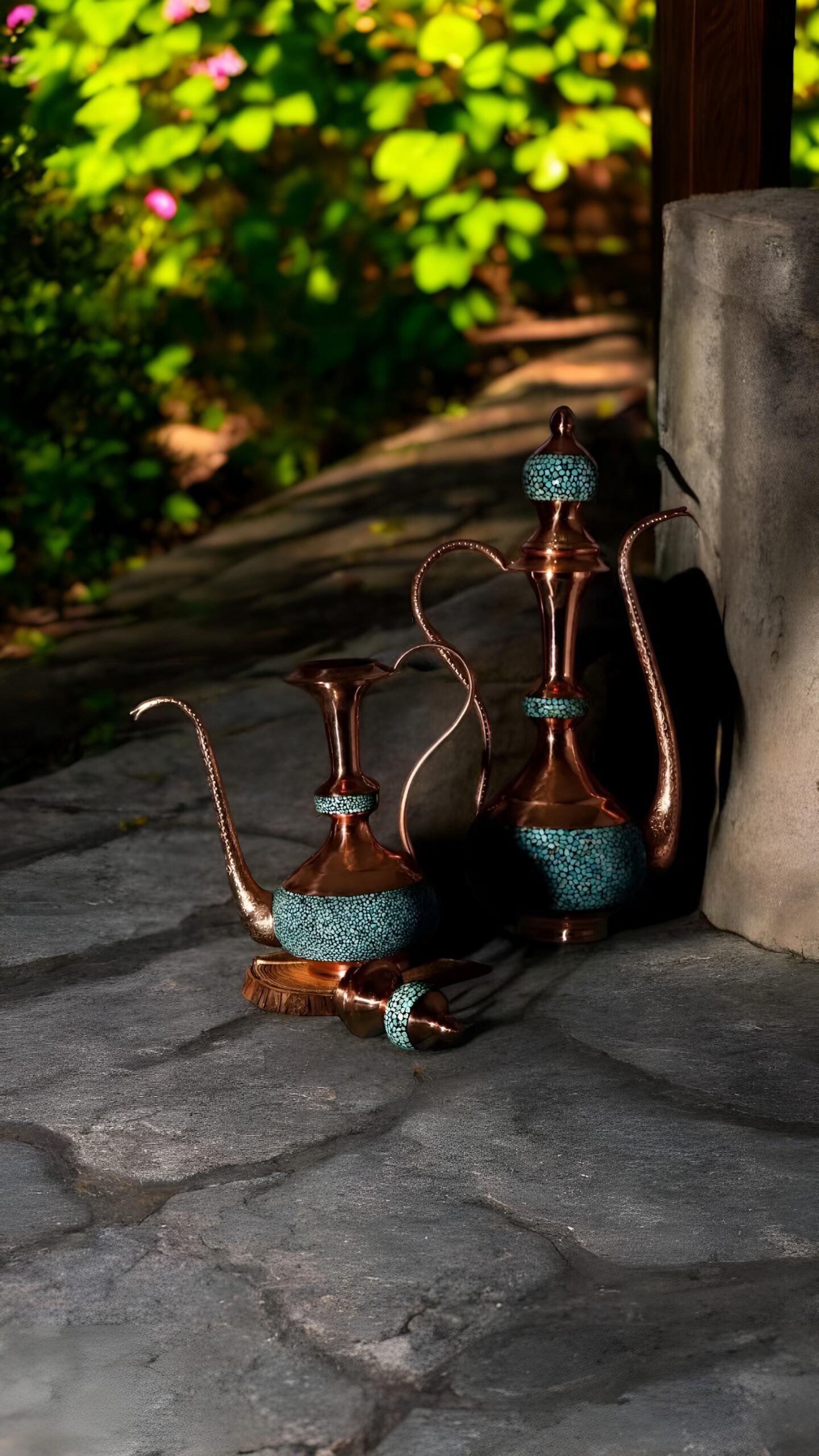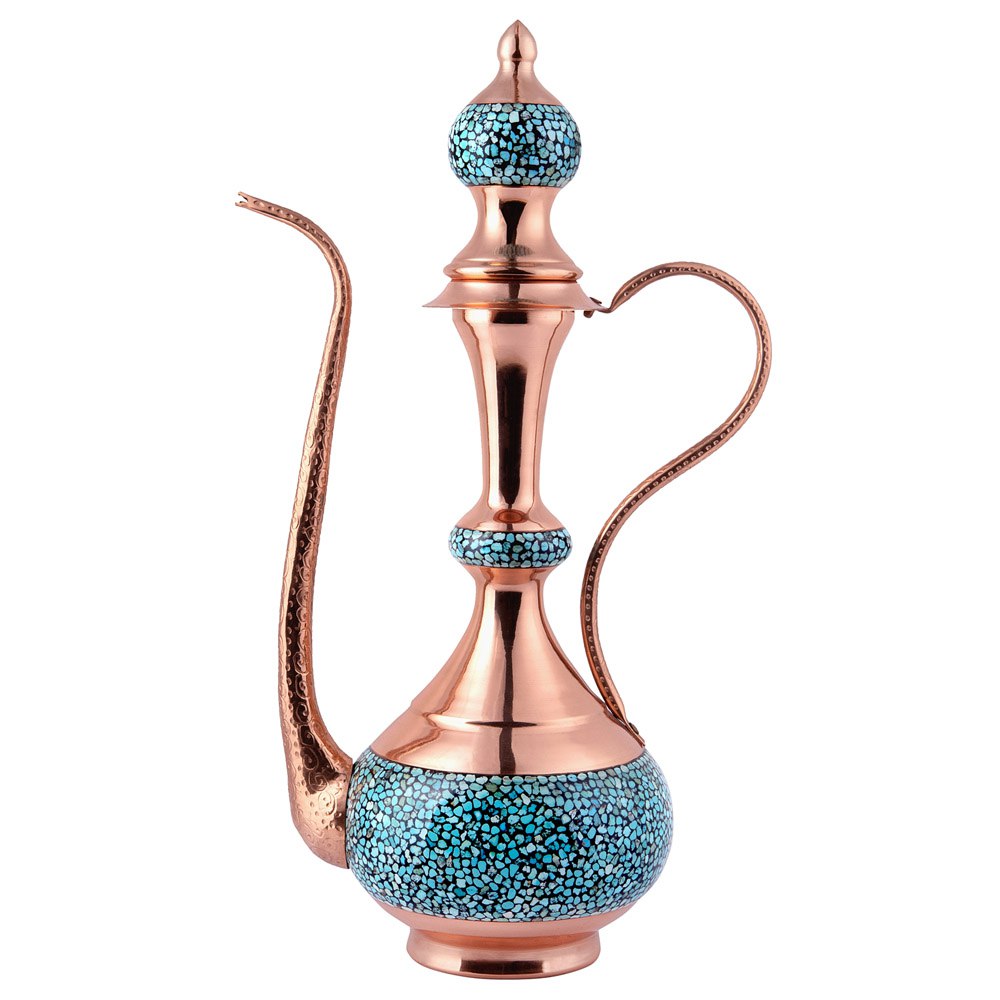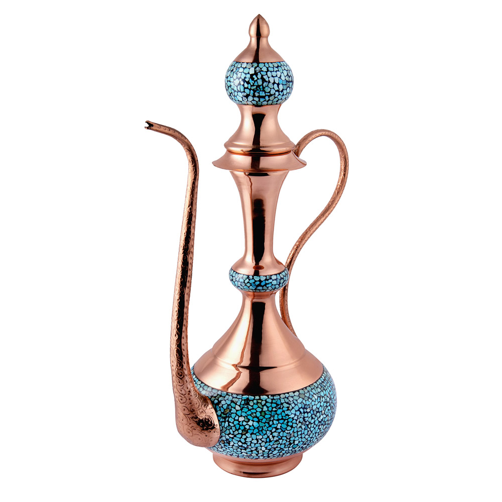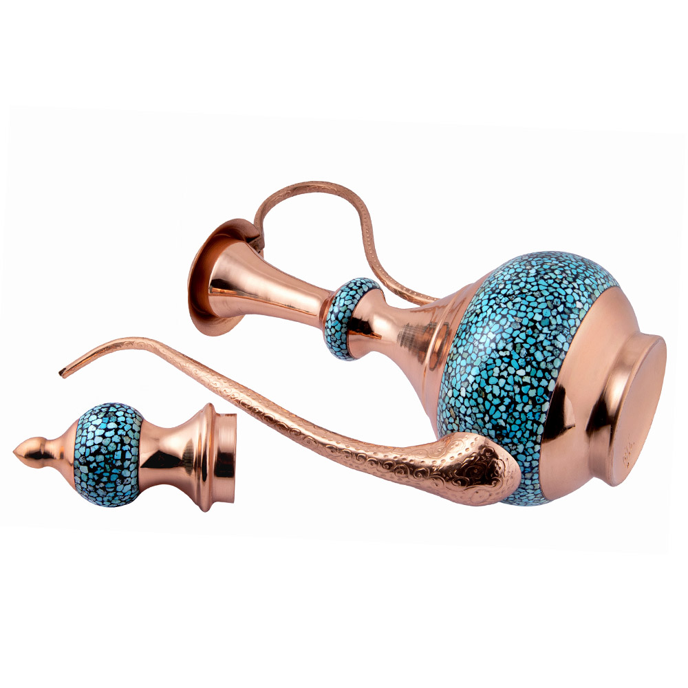 در این اثر هنری، قطعات سنگ فیروزه نیشابور با دقت و ظرافت روی بدنهی مسی نشانده میشوند . ترکیب رنگ