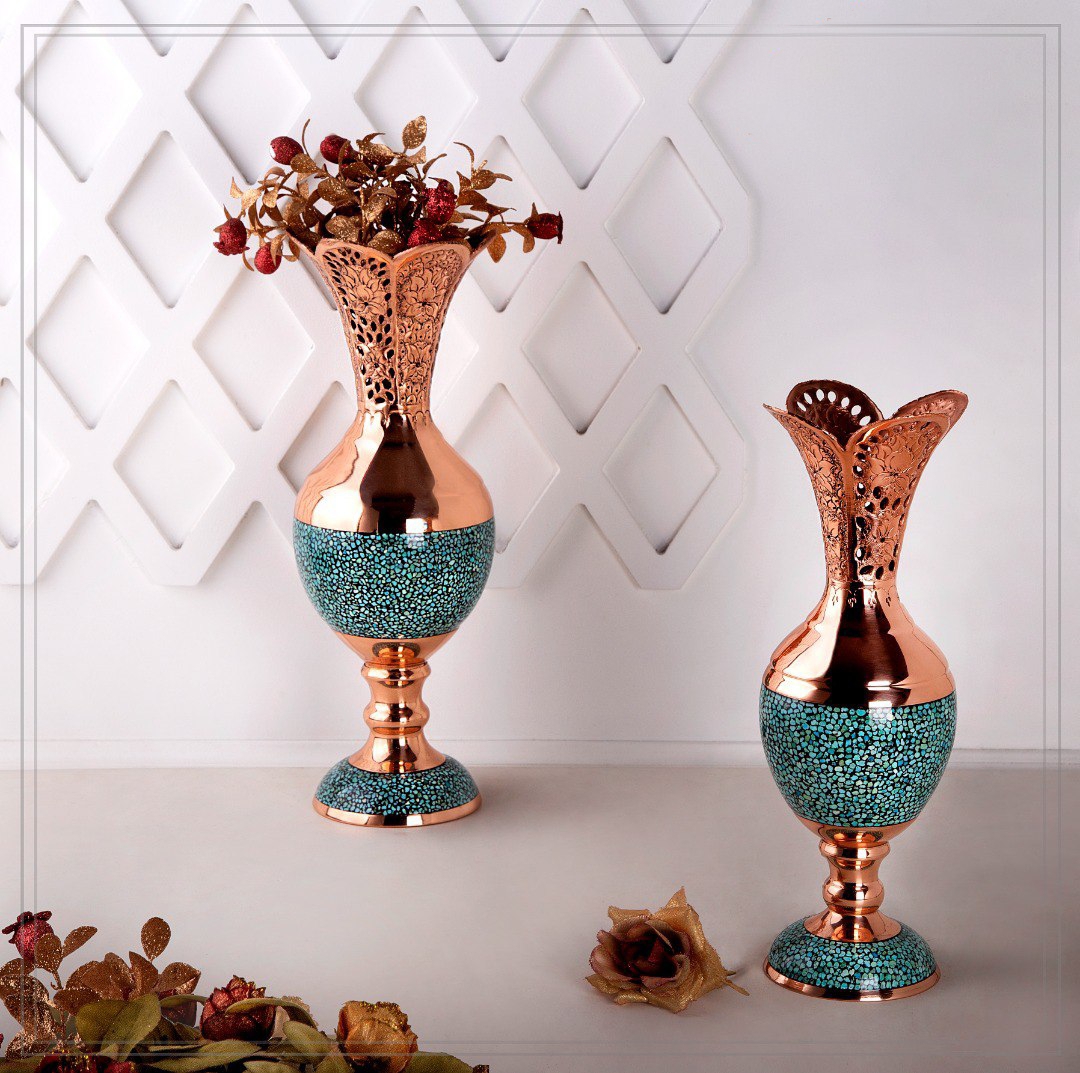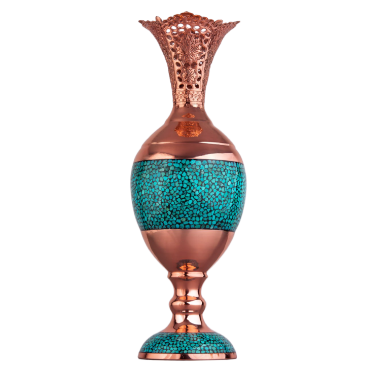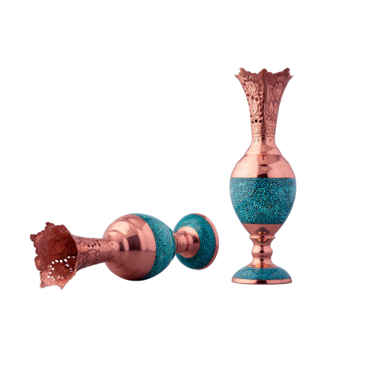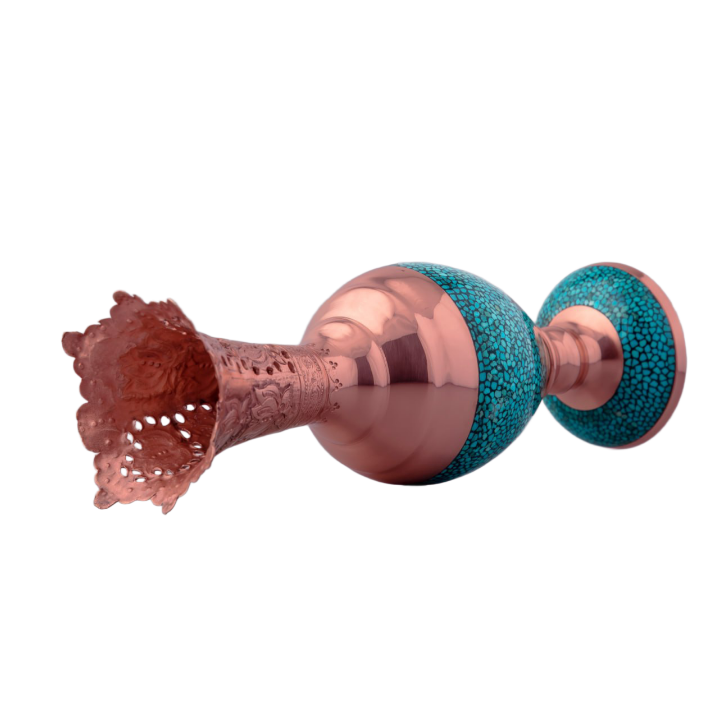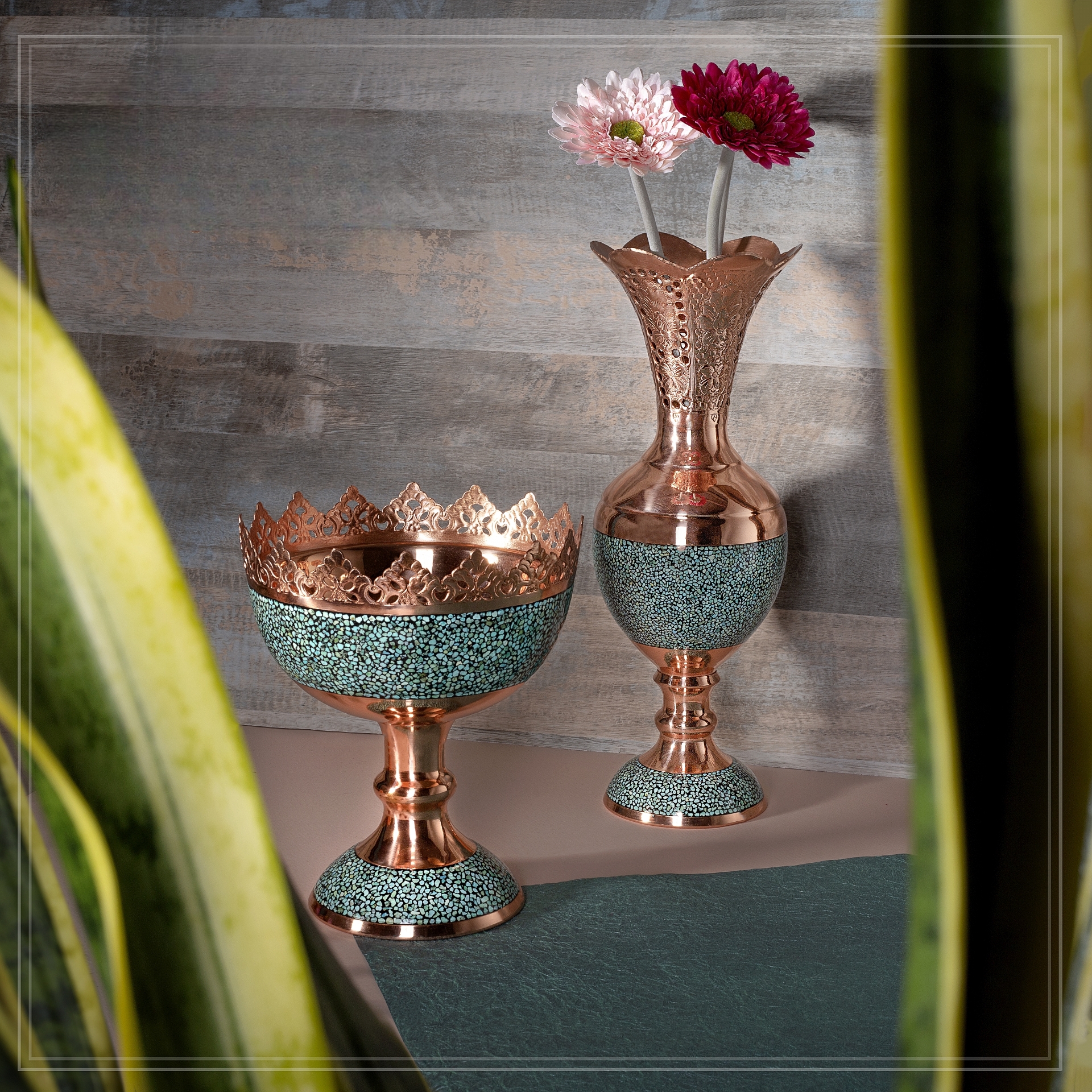 در این اثر هنری، قطعات سنگ فیروزه نیشابور با دقت و ظرافت روی بدنه‌ی مسی نشانده می‌شوند. ترکیب رنگ آبی فیروزه و درخشندگی مس، هارمونی خاصی ایجاد می‌کند که زیبایی دکوراسیون شما را دوچندان خواهد کرد.