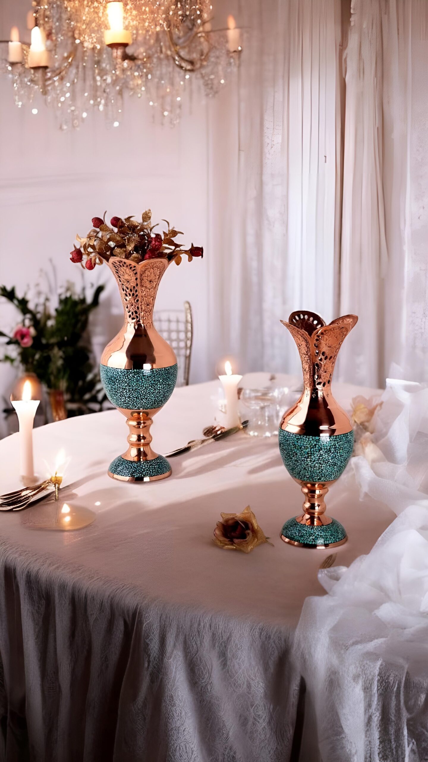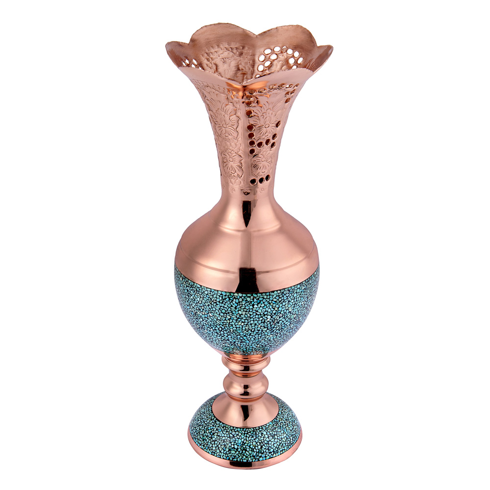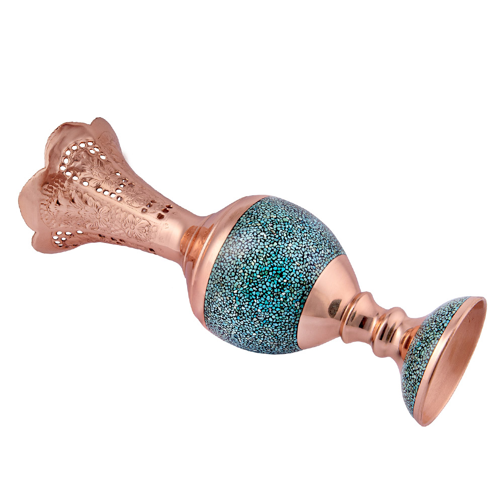 در این اثر هنری، قطعات سنگ فیروزه نیشابور با دقت و ظرافت روی بدنه‌ی مسی نشانده می‌شوند. ترکیب رنگ آبی فیروزه و درخشندگی مس، هارمونی خاصی ایجاد می‌کند که زیبایی دکوراسیون شما را دوچندان خواهد کرد.